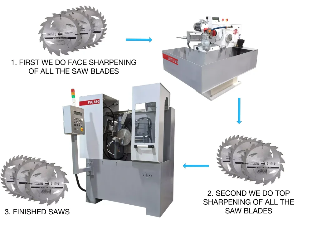 Im Allgemeinen schärfen Schärfbetriebe die Vorderseite aller Sägeblätter, die sie haben, richten dann die Maschine so ein, dass sie die Oberseite des Zahns schärft, und schleifen alle Oberseiten der Sägeblätter.